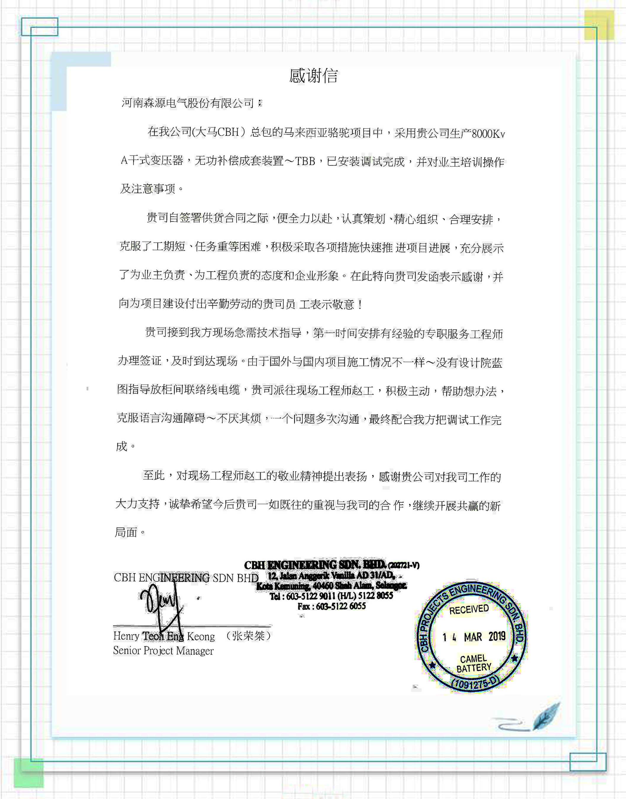 近日,一封来自马来西亚大马CBH公司的感谢信漂洋过海传到万搏(中国)_万搏(中国)电气,万搏(中国)_万搏(中国)提供的卓越产品和一流服务赢得了他们由衷的赞誉。